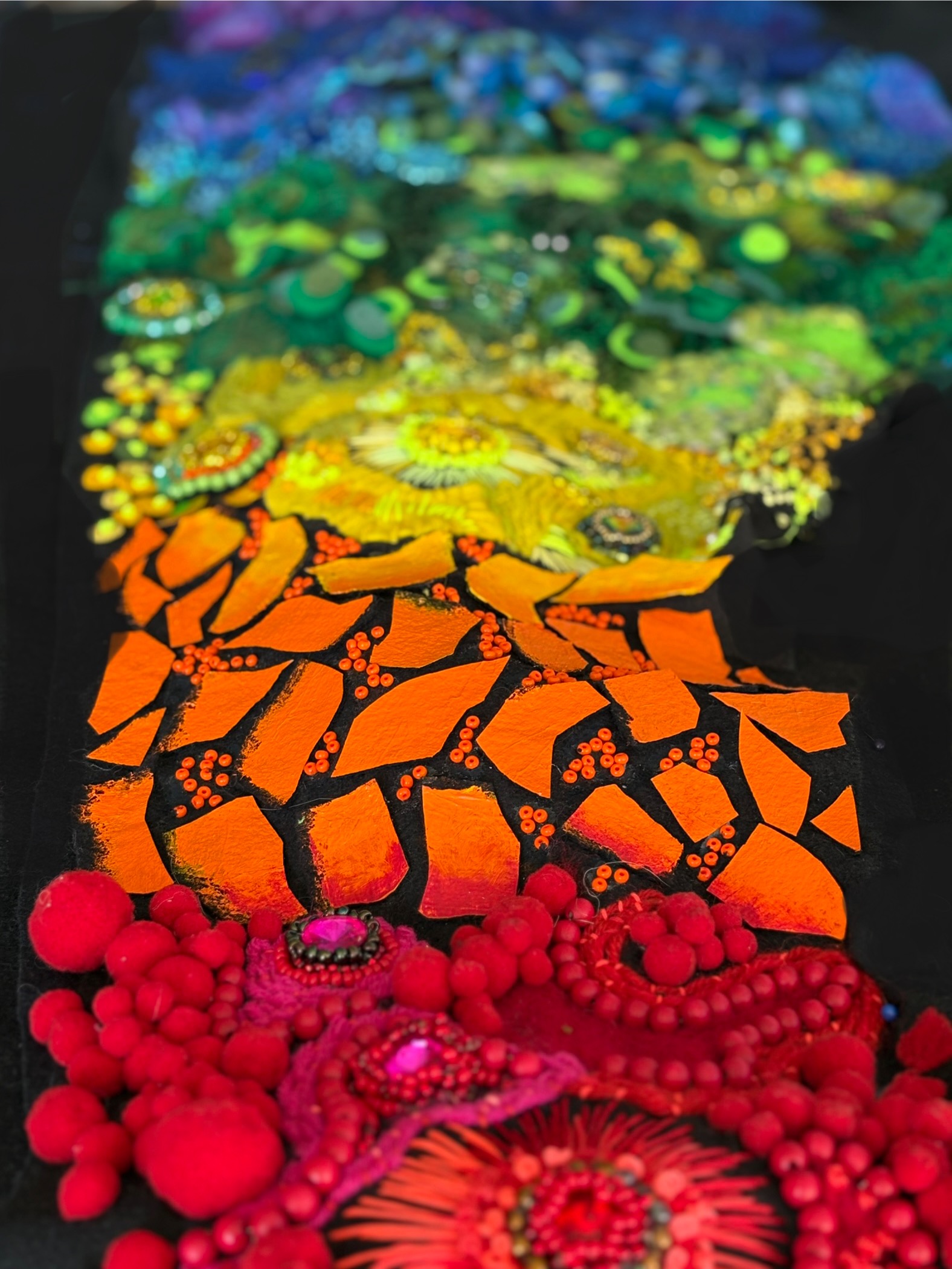 Artist Juliet Karelsen visited Iceland in the fall of 2024 was inspired by the raw beauty of the landscape – particularly the acres and acres of black lava rocks covered by green moss. She was so moved by the other worldliness that she decided to create this site-specific installation under the stairwell for the Maine Jewish Museum.